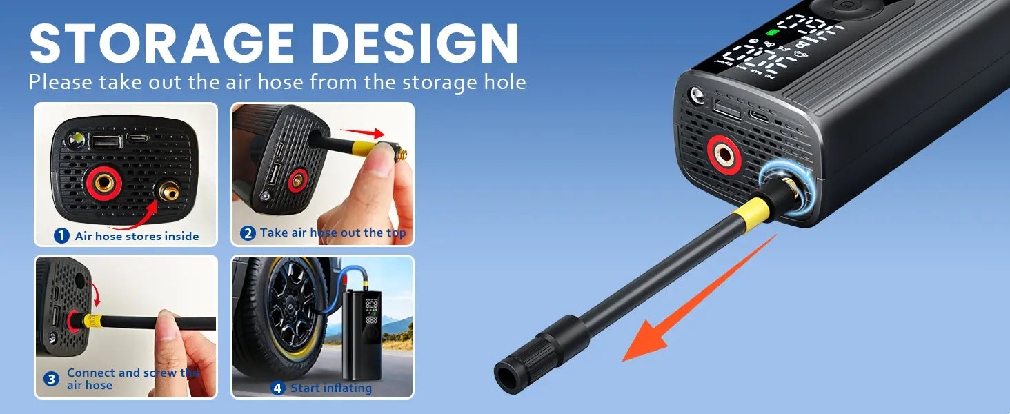 - ๐๐จ๐ฐ ๐ญ๐จ ๐๐ฌ๐: 1, Take out the air hose in the pump and connect it to the tire. 2, Select the inflation mode and start inflation. 3, Waiting for auto shutoff, complete the inflation.
